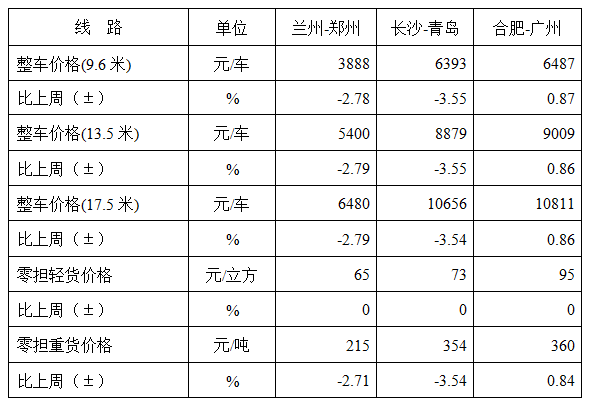 表1 本周部分線路平均價格及環(huán)比情況對比