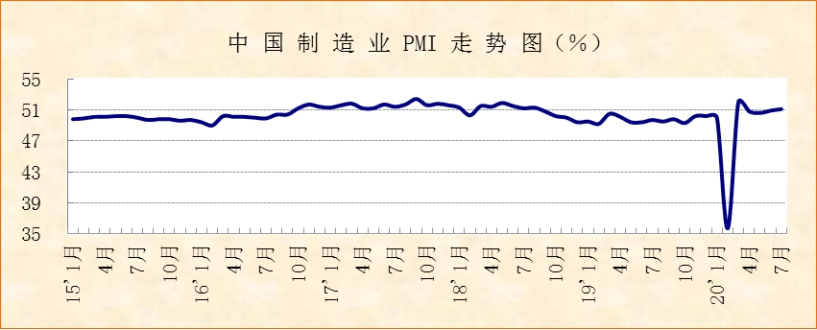中國物流與采購聯合會、國家統計局服務業調查中心發布的2020年7月份中國制造業采購經理指數(PMI)為51.1%,較上月上升0.2個百分點,經濟回升向好發展。從分項指數來看,經濟恢復態勢有所增強,進出口繼續保持恢復勢頭,消費品和新動能行業較快增長。當前需重點關注市場需求不足問題。