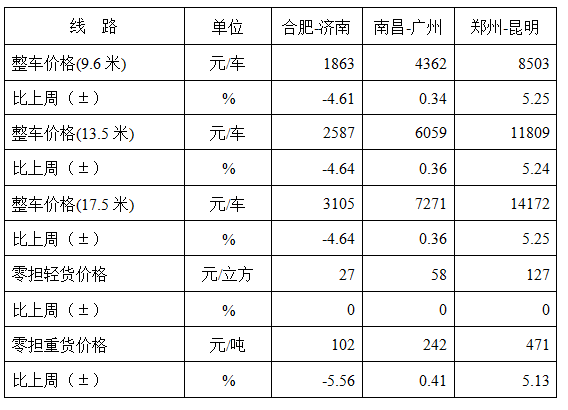 表1 本周部分線路平均價格及環比情況對比