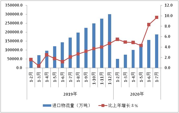 1-7月份,我國進口物流總額增長9.7%,增速比上半年提高1.4個百分點,連續三個月回升。主要貨類中,大宗商品、農產品和部分機電產品進口量實現兩位數增長。其中,進口鐵礦砂同比增長11.8%;鋼材同比增長49%;原油同比增長12.1%;糧食和肉類同比分別增長23%和74%;集成電路增長24.8%。