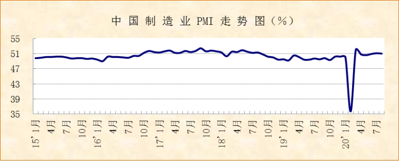 中國物流與采購聯(lián)合會、國家統(tǒng)計局服務業(yè)調查中心發(fā)布的2020年8月份中國制造業(yè)采購經(jīng)理指數(shù)(PMI)為51%,較上月小幅回落0.1個百分點,連續(xù)6個月運行在50%以上,經(jīng)濟保持平穩(wěn)復蘇態(tài)勢。從分項指數(shù)來看,市場需求加快回升,供需協(xié)同性增強,新動能加快復蘇,大中型企業(yè)較快增長,經(jīng)濟高質量發(fā)展具備基礎。當前需要重點關注原材料價格高位上升和小企業(yè)經(jīng)營壓力加大問題。
