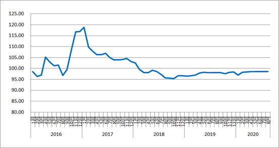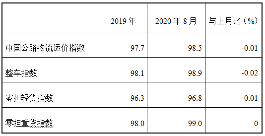 2020年8月份,由中國物流與采購聯合會和林安物流集團聯合調查的中國公路物流運價指數為98.5點,與上月相比波動較小,但已連續兩個月呈現略微回調趨勢,與去年同期相比仍增長0.5%。從各周指數看,第一、二、三周運價指數環比小幅回落,第四周指數環比小幅回升。