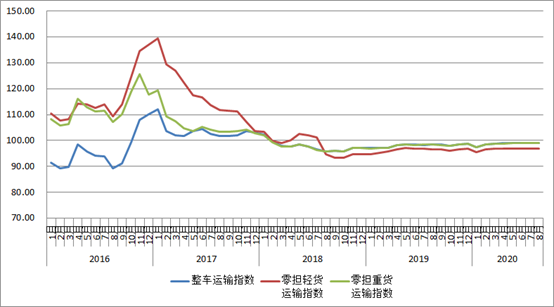 分車型指數看,各車型指數環比漲跌互現,同比均有小幅增長。以大宗商品及區域運輸為主的整車指數為98.9點,比上月回落0.02%,比上年同期回升0.6%。零擔指數中,零擔輕貨指數為96.8點,比上月回升0.01%,比上年同期回升0.1%;零擔重貨指數為99.0點,與上月基本持平,比上年同期回升0.6%。