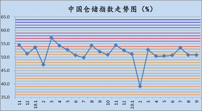 中國物流與采購聯合會與中儲發展股份有限公司聯合調查的2020年9月份中國倉儲指數為50.8%,與上月持平。設施利用率、收費價格、主營業務成本、平均庫存周轉次數、業務活動預期等主要分項指數較上月均有所回升。