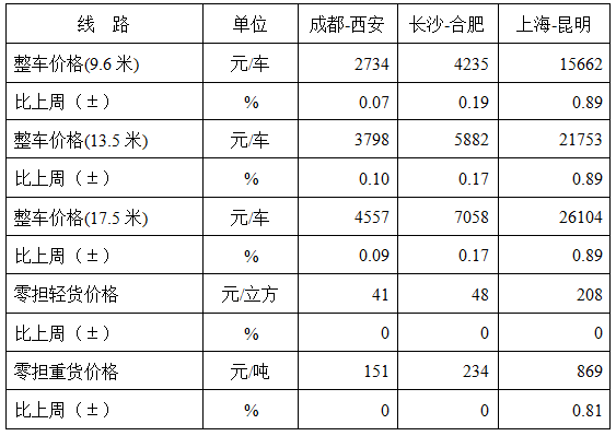 表1 本周部分線路平均價格及環比情況對比