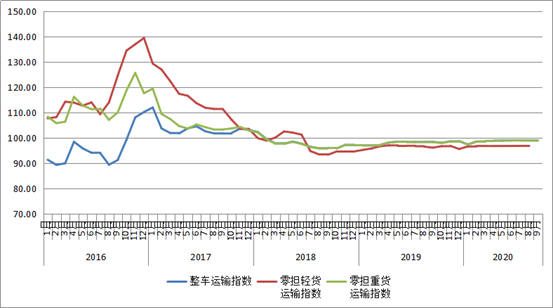 分車型指數看,各車型指數環比漲跌互現,同比優于去年同期。以大宗商品及區域運輸為主的整車指數為98.9點,比上月回落0.02%,比上年同期回升0.5%。零擔指數中,零擔輕貨指數為96.9點,比上月回升0.04%,比上年同期回升0.4%;零擔重貨指數為98.9點,比上月回落0.06%,比上年同期回升0.6%。