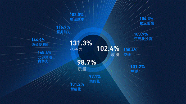 西部陸海新通道發展指數首期為113.2,以100為分水嶺,大于100代表呈發展趨勢、小于100代表呈減緩趨勢。發展指數與一帶一路“五通”指數研究報告相呼應,同時呈現增長趨勢。其中,規模發展指數、質量發展指數和競爭力發展指數分別為102.4、98.7和131.3,上述數據反映出我國西部陸海新通道在2020對比2019年上半年,通道規模不斷擴大,通道競爭力顯著提升,但短期內還存在規模發展與質量提升不同步的現象。