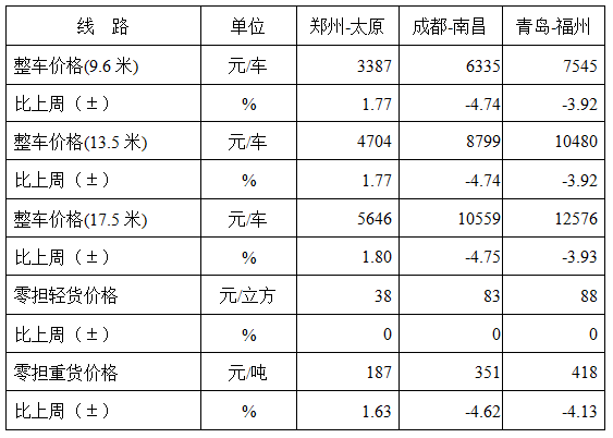 表1 本周部分線路平均價格及環比情況對比