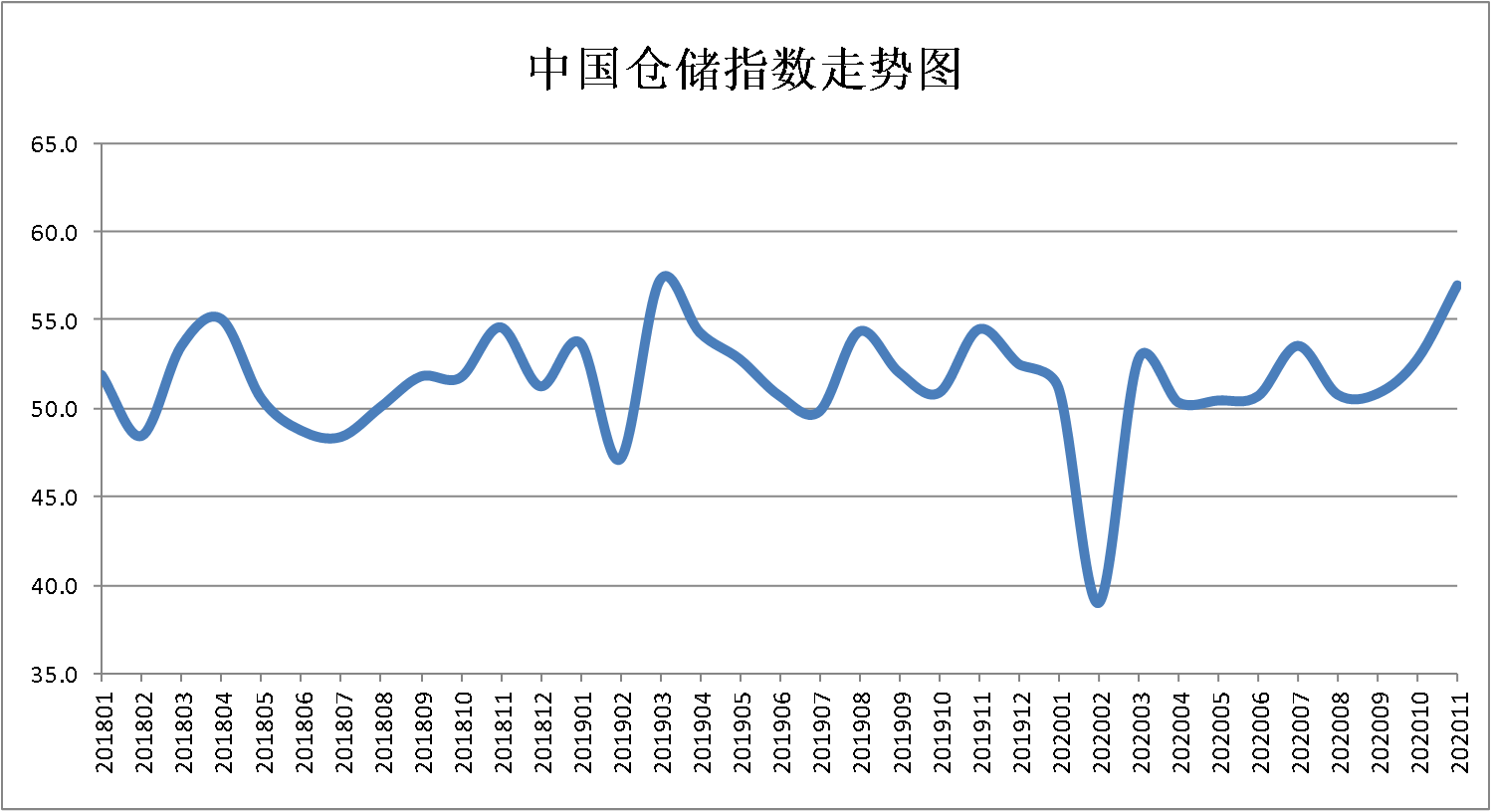 中國物流與采購聯合會和中儲發展股份有限公司聯合調查的中國倉儲指數,2020年11月份為56.9%,較上月上升4.1個百分點,連續九個月保持在榮枯線以上,且本月達到二十個月以來的高點,新訂單、業務利潤、庫存周轉次數及企業員工等主要分項指數均保持在榮枯線上,反映出在國內經濟持續穩定恢復的背景下,倉儲行業保持良好發展態勢。從分項指數變化情況來看,有以下幾個特點: