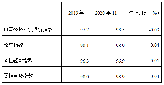 2020年11月份,由中國物流與采購聯合會和林安物流集團聯合調查的中國公路物流運價指數為98.5點,比上月回落0.03%,比去年同期增長0.7%。從各周指數看,第一、三周運價指數環比小幅回升,第二、四周指數環比小幅回落。