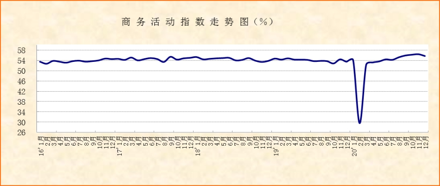 四季度,商務活動指數均值為56.1%,好于三季度的55.1%和二季度的53.7%,市場經營活動呈現逐季上升趨勢,表明非制造業恢復力度進一步加強。分行業看,建筑業商務活動指數持續保持在60%左右的較高水平運行,服務業商務活動指數四季度均值保持在55.3%,較三季度和二季度分別上升1.1和2.7個百分點,行業運行均保持強勢恢復態勢,為2021年經濟穩定向好奠定基礎。