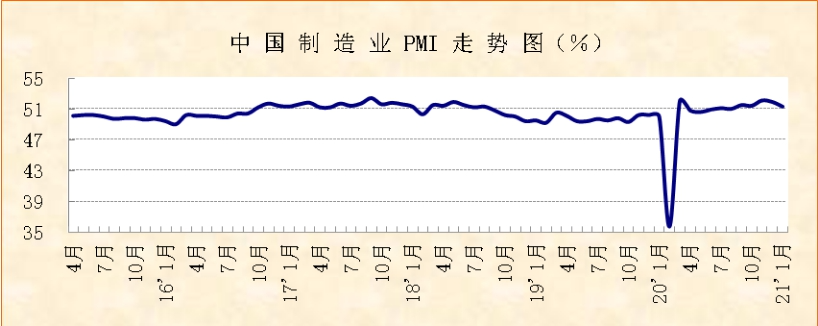 中國物流與采購聯合會、國家統計局服務業調查中心發布的2021年1月份中國制造業采購經理指數(PMI)為51.3%,較上月下降0.6個百分點,連續7個月位于51%及以上,顯示在局部疫情反彈的情況下,經濟仍保持較快上升勢頭。分項指數變化顯示,1月份市場供需增速有所下降,仍保持在較好水平,其中消費品行業發展勢頭較好。大中小型企業均保持穩定運行,市場對后市預期較為樂觀。企業成本較快上升問題值得關注。