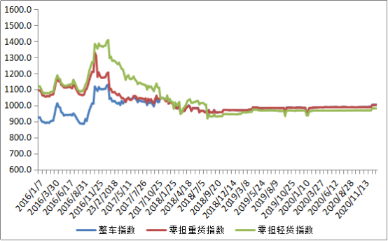 分車型看,各車型指數環比有不同程度回落。其中,整車指數為1005.83點,比上月回落0.07%;零擔輕貨指數為981.94點,與上月基本持平;零擔重貨指數為1003.93點,比上月回落0.09%。
