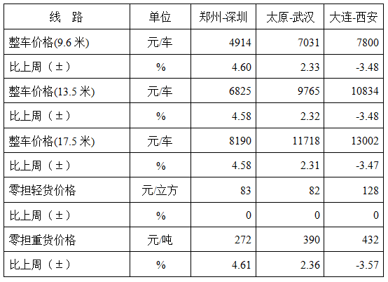 分車型看,各車型指數環比波動較小。其中,整車指數為1008.98點,比上周回升0.02%;零擔輕貨指數為981.65點,與上周基本持平;零擔重貨指數為1007.32點,比上周回升0.04%。