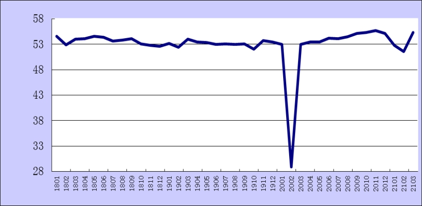 中國(guó)物流與采購(gòu)聯(lián)合會(huì)、國(guó)家統(tǒng)計(jì)局服務(wù)業(yè)調(diào)查中心采購(gòu)經(jīng)理調(diào)查發(fā)布的2021年3月份綜合PMI產(chǎn)出指數(shù)為55.3%,較上月上升3.7個(gè)百分點(diǎn)。該指數(shù)是PMI指標(biāo)體系中反映當(dāng)期全行業(yè)(制造業(yè)和非制造業(yè))產(chǎn)出變化情況的綜合指數(shù),由制造業(yè)生產(chǎn)指數(shù)與非制造業(yè)商務(wù)活動(dòng)指數(shù)加權(quán)求和而成,權(quán)數(shù)分別為制造業(yè)和非制造業(yè)占GDP的比重。