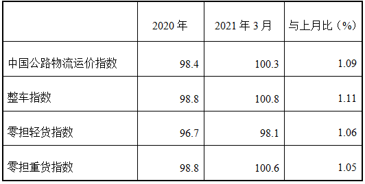 2021年3月份,由中國物流與采購聯合會和林安物流集團聯合調查的中國公路物流運價指數為100.3點,比上月回升1.1%,比去年同期增長1.9%。從各周指數看,第二、三周運價指數環比回落,第一、四周運價指數環比回升。