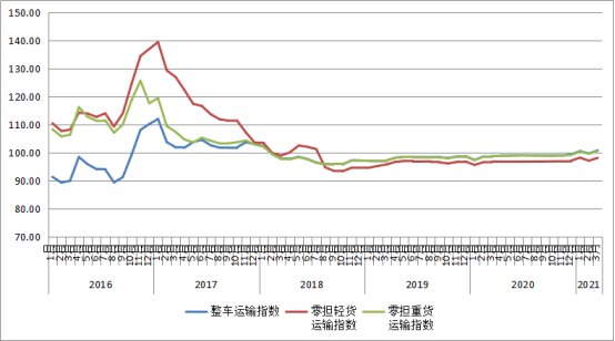 分車型指數看,各車型指數環比均有所回升,同比繼續小幅增長。以大宗商品及區域運輸為主的整車指數為100.8點,比上月回升1.11%,比上年同期回升2%。零擔指數中,零擔輕貨指數為98.1點,比上月回升1.06%,比上年同期回升1.4%;零擔重貨指數為100.6點,比上月回升1.05%,比上年同期回升1.9%。