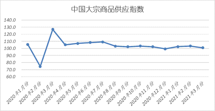 2021年3月份,大宗商品供應指數較上月回落2.4個百分點,至101.0%,顯示隨著各地環保限產政策從嚴,特別是“碳中和”正在引領部分行業第二次供給側改革,導致部分商品生產受阻,產量減少,當前商品供應增速回落。不過,由于商品價格較為堅挺,企業生產利潤尚可,生產熱情仍較為高漲,所以商品供應僅是增速回落,整體供應量未見下降。從各主要商品來看,本月各商品供應量變化情況出現分化,鋼鐵、原煤、成品油等商品受環保限產、企業檢修等因素影響,供應量開始明顯減少,有色金屬和化工供應量則出現增速回落,不過鐵礦石和汽車供應量受到港量增加以及季節性等因素影響,有所增加。