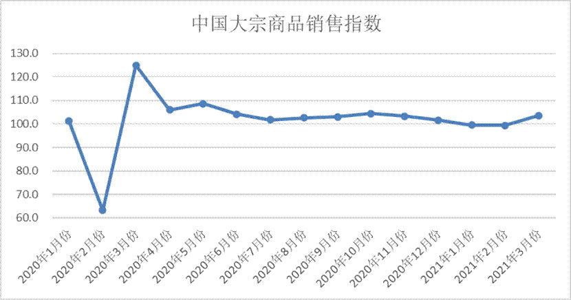 2021年3月份,大宗商品銷售量指數止跌反彈至103.6%,為近五個月以內的最高點,顯示隨著天氣逐漸回升,國內基建投資力度放大,市場終端需求開始集中釋放,商品成交量明顯增加。各主要商品中,鋼鐵、煤炭、成品油和汽車銷售量止跌反彈,且升幅明顯,有色金屬和化工銷售量繼續增長,且增速均有所加快,鐵礦石銷售量受鋼廠限產影響,增速有所減緩。
