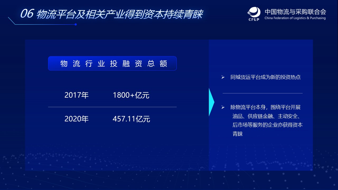 據公開資料顯示,物流行業投融資總額自2017年達到頂峰后,已連續三年成下降態勢。2020年受疫情影響,物流行業資本市場更是持續遇冷,年投融資總額457.11億元,僅為2017年的四分之一。但是從細分領域可以看出,同城貨運平臺成為新的投資熱點。除物流平臺本身,圍繞平臺開展油品、供應鏈金融、主動安全、汽車后市場等服務的企業均獲得資本青睞,說明車后市場是物流平臺進行業務拓展的主要方向,亦是平臺企業未來的盈利手段。