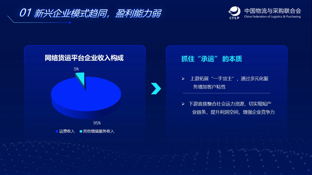 據中物聯平臺分會統計,網絡貨運平臺企業的運費收入占平臺總營業收入的平均比例為95%,收入構成過于簡單,且90%以上的企業未實現有效盈利,說明在網絡貨運業態下運輸服務的利潤空間依然很小。企業在經營過程中應抓住承運的本質,發揮平臺整合資源的優勢,上游拓展“一手貨主”,通過多元化服務增加客戶粘性,下游直接整合社會運力資源,切實縮短產業鏈條,提升利潤空間,增強企業競爭力。