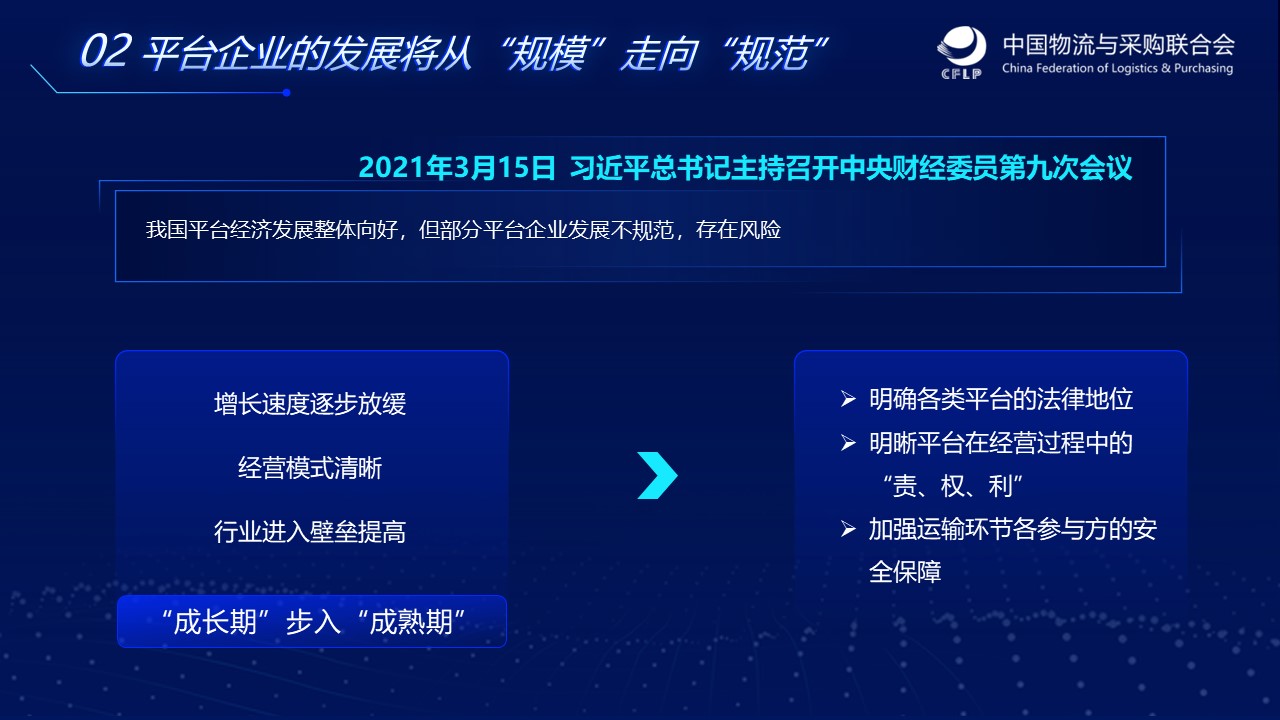 3月15日,習近平總書記主持召開中央財經委員會第九次會議,會議指出我國平臺經濟發展整體向好,但部分平臺企業發展不規范,存在風險。網絡貨運企業的盲目擴張期已經結束,從行業發展的生命周期來看,網絡貨運業態的發展已從“成長期”逐步步入“成熟期”,業務規模的增長速度逐步放緩,主要經營模式清晰,行業進入壁壘提高,企業競爭日漸激烈。在此背景下,規范經營秩序、消除惡性競爭,是行業發展應重點關注的問題。明確各類平臺的法律地位,明晰平臺在經營過程中的“責、權、利”,加強運輸環節各參與方的安全保障,為行業發展營造一個健康、規范、可持續發展的環境是未來關注的重點。