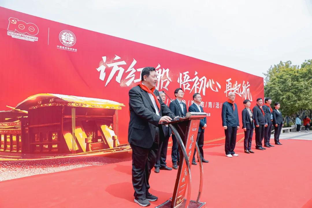 方賢業代表中國醫藥物資協會致辭。他表示為慶祝中國共產黨成立100周年,中國醫藥物資協會決定開展系列慶祝活動,今天到嘉興南湖開展“訪紅船、悟初心、再起航”實地參觀教育活動,是協會極為重視極為精心組織的系列活動之一。