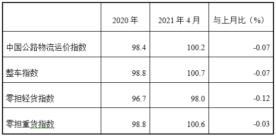 表1 2021年4月中國公路物流運(yùn)價指數(shù)表