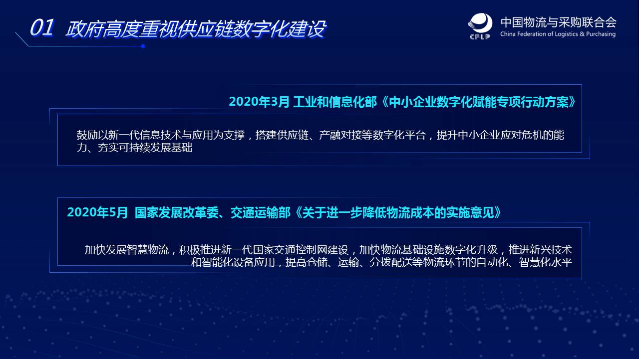 2020年3月,工業和信息化部印發的《中小企業數字化賦能專項行動方案》中明確指出,鼓勵以新一代信息技術與應用為支撐,搭建供應鏈、產融對接等數字化平臺,提升中小企業應對危機的能力、夯實可持續發展基礎。同年5月,國家發展改革委、交通運輸部印發的《關于進一步降低物流成本的實施意見》也明確指出,要加快發展智慧物流,積極推進新一代國家交通控制網建設,加快物流基礎設施數字化升級,推進新興技術和智能化設備應用,提高倉儲、運輸、分撥配送等物流環節的自動化、智慧化水平。