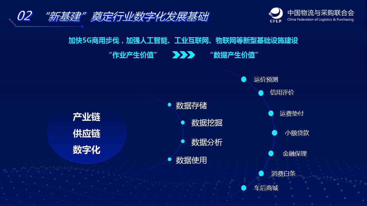 “加快5G商用步伐,加強人工智能、工業互聯網、物聯網等新型基礎設施建設”是我國經濟建設重要戰略部署, “新基建”作為數字經濟基礎保障地位得到凸現。在“新基建”的助力下,圍繞物流供應鏈、產業鏈的相關企業數字化水平明顯提高,實現數據的跨界融合應用。部分龍頭企業已經通過對數據的存儲、挖掘、分析和使用實現價值轉移,開展運價預測、信用評價、運費墊付、小額貸款、金融保理、消費白條、車后商城等基于業務數據的增值服務并實現盈利,完成了物流行業由“作業產生價值”向“數據產生價值”的路徑探索,為進一步提升行業高質量服務水平,構建智慧物流生態體系奠定了良好的基礎。