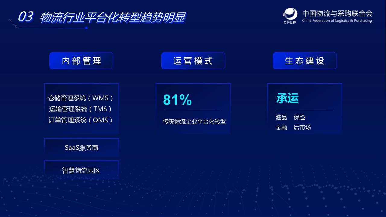 伴隨著技術進步與模式創新,物流行業的內部管理、運營模式、生態建設方面呈現出平臺化發展趨勢。在企業業務層面,產品化、標準化的倉儲管理系統(WMS)、運輸管理系統(TMS)、訂單管理系統(OMS)的應用逐漸成熟,實現了企業業務的平臺化管理和信息互聯互通,破除信息孤島。物流園區也充分利用互聯網、物聯網等信息技術,向服務型、功能型、智能型的新模式轉型,實現線上線下一體化、數字化和平臺化管理。物流軟件服務商通過SaaS服務的模式從原來的產品服務提升為平臺服務。物流硬件服務商也通過平臺模式提供定位、ETC、主動安全等服務,助力中小物流企業快速提升信息化管理水平。在運營模式方面,81%的傳統物流企業有意愿轉型或拓展物流平臺業務以提升社會化運力整合能力和運輸透明化管理能力,有效拓展業務規模,實現降本增效。在生態建設方面,平臺型物流企業依托交易數據建立以“承運”為核心的生態體系,油品、保險、金融、后市場等服務平臺應運而生,構建良性生態圈。