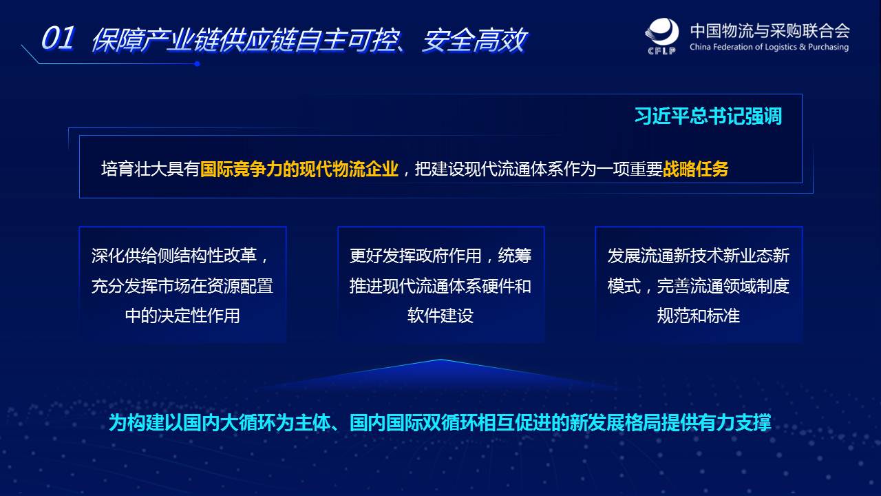 習近平總書記指出:流通體系在國民經濟中發揮著基礎性作用,構建新發展格局,必須把建設現代流通體系作為一項重要戰略任務來抓。要貫徹新發展理念,推動高質量發展,深化供給側結構性改革,充分發揮市場在資源配置中的決定性作用,更好發揮政府作用,統籌推進現代流通體系硬件和軟件建設,發展流通新技術新業態新模式,完善流通領域制度規范和標準,培育壯大具有國際競爭力的現代物流企業,為構建以國內大循環為主體、國內國際雙循環相互促進的新發展格局提供有力支撐,保障產業鏈供應鏈自主可控、安全高效。