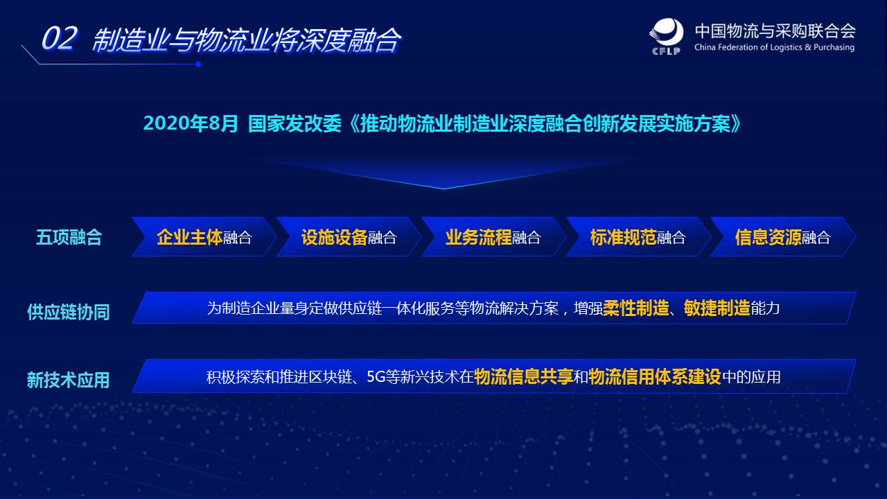 2020年8月,國家發改委印發了《推動物流業制造業深度融合創新發展實施方案》,文件指出,要促進企業主體、設施設備、業務流程、標準規范、信息資源五項融合,支持物流企業與制造企業通過市場化方式創新供應鏈協同共建模式;實現樞紐園區、鐵路專用線、倉庫等物流基礎設施的有機聯動;引導物流、快遞企業為制造企業量身定做供應鏈一體化服務等物流解決方案,增強柔性制造、敏捷制造能力;同時加強各項標準的協調銜接,積極探索和推進區塊鏈、5G等新興技術在物流信息共享和物流信用體系建設中的應用,實現采購、生產、流通等上下游環節信息實時采集、互聯共享,推動提高生產制造和物流一體化運作水平。