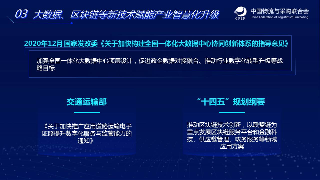 2020年12月,國家發改委發布《關于加快構建全國一體化大數據中心協同創新體系的指導意見》,指出要加強全國一體化大數據中心頂層設計,促進政企數據對接融合、推動行業數字化轉型升級等戰略目標。在此背景下,交通運輸部發布《關于加快推廣應用道路運輸電子證照提升數字化服務與監管能力的通知》,實現道路運輸電子證照實時交互共享和互信互認,是運輸物流領域數字化賦能的重要舉措。此外,“十四五”規劃綱要指出,要推動區塊鏈技術創新,以聯盟鏈為重點發展區塊鏈服務平臺和金融科技、供應鏈管理、政務服務等領域應用方案,進一步助力行業智慧化升級。