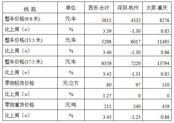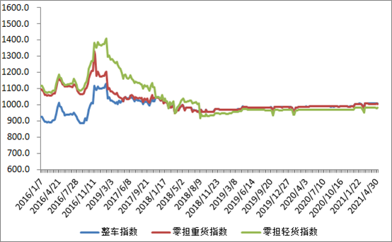 分車型看,各車型指數環比有所回升。其中,整車指數為1006.41點,比上周回升0.02%;零擔輕貨指數為981.46點,與上周基本持平;零擔重貨指數為1005.66點,比上周回升0.04%。