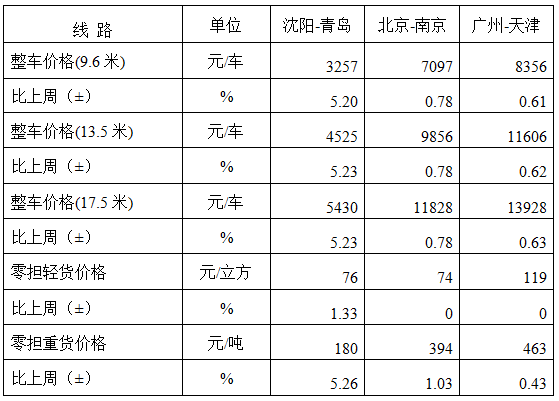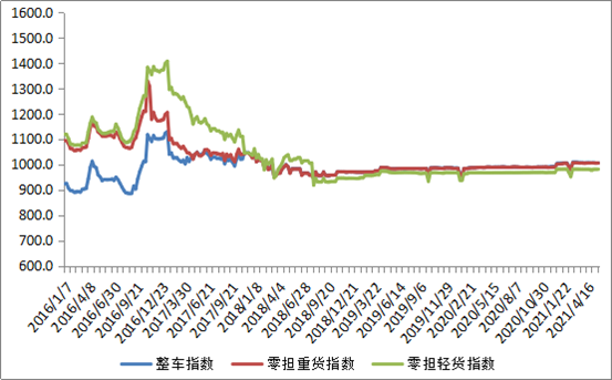 分車型看,各車型指數環比有所回升。其中,整車指數為1006.95點,比上周回升0.05%;零擔輕貨指數為981.46點,與上周基本持平;零擔重貨指數為1006.31點,比上周回升0.06%。