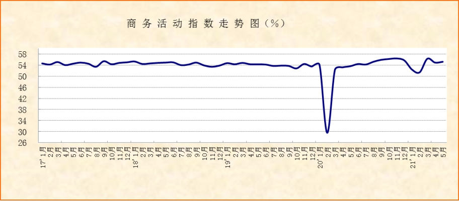 中國物流與采購聯(lián)合會、國家統(tǒng)計局服務(wù)業(yè)調(diào)查中心發(fā)布的2021年5月份中國非制造業(yè)商務(wù)活動指數(shù)較上月回升0.3個百分點至55.2%,新訂單指數(shù)較上月回升0.7個百分點至52.2%,市場供需增速在上月平穩(wěn)恢復(fù)的基礎(chǔ)上有所加快。在供需增速加快的帶動下,就業(yè)有所回穩(wěn),從業(yè)人員指數(shù)較上月小幅回升0.2個百分點至48.9%。企業(yè)預(yù)期也保持穩(wěn)定,業(yè)務(wù)活動預(yù)期指數(shù)連續(xù)3個月穩(wěn)定在63%左右。綜合指數(shù)變化,非制造業(yè)整體呈現(xiàn)穩(wěn)中向好跡象。