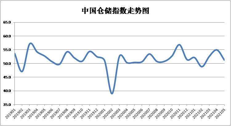中國物流與采購聯合會和中儲發展股份有限公司聯合調查的中國倉儲指數,2021年5月份為51.3%,較上月回落3.7個百分點。新訂單、業務量、期末庫存、平均庫存周轉次數等主要分項指數均有明顯回落,但仍保持在榮枯線以上,表明行業整體仍保持平穩向好發展態勢。從分項指數變化情況來看,有以下幾個特點: