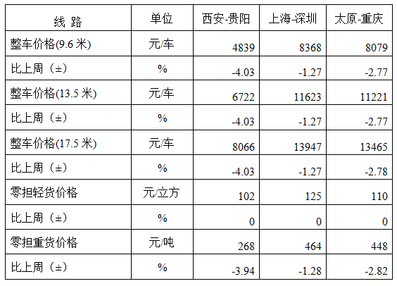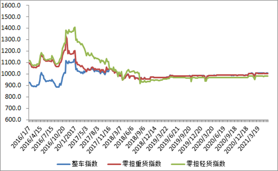 分車型看,各車型指數環比有所回落。其中,整車指數為1006.75點,比上周回落0.02%;零擔輕貨指數為981.50點,與上周基本持平;零擔重貨指數為1006.19點,比上周回落0.01%。
