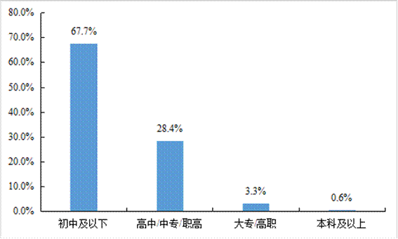 2.4 調查顯示,被調查貨車司機的文化水平以初中及以下為主,占比為67.7%;其次為高中/中專/職高,占比為28.4%;大專/高職占比僅為3.3%;本科及以上司機占比為0.6%。初中及以下占比較2016年調查有所增加,貨車司機仍然是低學歷從業者重要的就業渠道。