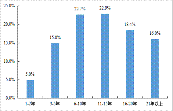 2.5 數據顯示,被調查貨車司機從業時間基本在6年及以上。其中10年以上從業司機數量占比為57.3%;6-10年從業司機數量占比22.7%,顯示貨車司機就業穩定性較強。5年以下從業司機數量占比為20%,較2016年調查情況有所減少,貨車司機對年輕從業者吸引力顯著減弱。