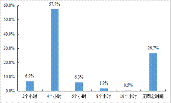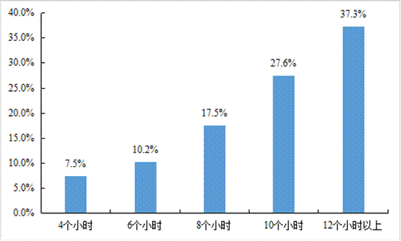 3.3 調查顯示,被調查貨車司機中,37.3%的貨車司機日均工作時長在12小時以上;工作時長在10小時和8小時左右的分別為27.6%和17.5%;三者合計,82.4%的貨車司機日均工作時長在8小時及以上,存在疲勞駕駛風險。貨車司機普遍工作時間較長、勞動強度大。但是,與較長的工作時間相比,司機等待、停車等無效工作時長占比依然較大。
