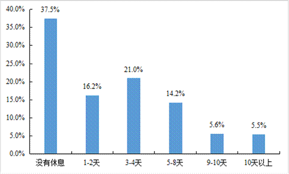 3.6 調查顯示,37.5%的貨車司機沒有休息時間。16.2%的貨車司機平均每月1-2天休息時間,還有21.0%的貨車司機每月平均有3-4天的休息時間,14.2%的司機休息5-8天,休息9天以上的占11.1%。與其他行業相比,貨車司機休息時間總體顯然不足。