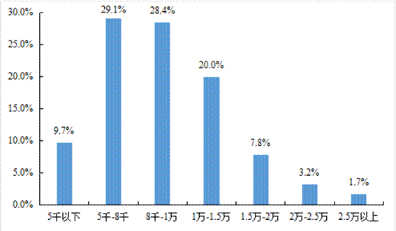 3.7 調查顯示,29.1%的貨車司機月均收入為5000-8000元;28.4%的貨車司機月均收入為8000-10000元,兩者合計為57.5%。20.0%的貨車司機月均收入在10000-15000元,12.7%的貨車司機月均收入在15000元以上,僅有9.7%的貨車司機月均收入在5000元以下。