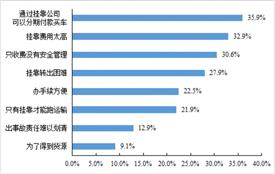 3.11 調查顯示,35.9%的貨車司機采用掛靠經營主要是為了分期付款買車,主要是因為個人貸款無法“0”首付,同時貨車司機征信較差,很多司機征信不足無法獲得貸款。22.5%的貨車司機認為通過掛靠經營可以便捷獲取車輛營運證,辦手續方便。21.9%的貨車司機存在只有掛靠經營才能跑運輸的錯誤認識。在掛靠收費方面,32.9%的貨車司機反映車輛掛靠的費用偏高,有的地方單車年掛靠費在3000-4000元。在安全管理方面,30.6%的貨車司機認為掛靠企業只收費沒有履行安全管理責任,這也導致12.9%的貨車司機反映掛靠車輛出事故責任難以劃清。
