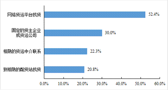 3.12 調查顯示,52.4%的貨車司機在貨運互聯網平臺(網絡貨運平臺和交易撮合平臺)上尋找貨源,占比較2016年調查情況大幅提高。貨運互聯網平臺已經成為零散運輸司機尋找貨源的主渠道。有固定的貨主企業或貨運公司提供貨源的司機占比30%,合同運輸貨源較2016年調查有所下降。傳統零散運輸找相熟的貨運中介或相熟的配貨站找貨的分別占22.3%和20.8%,較2016年調查明顯下滑。
