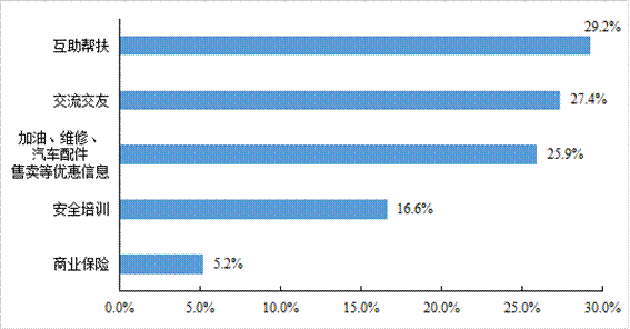3.13 調查顯示,除了通過貨運互聯網平臺尋找貨源外,29.2%的貨車司機從平臺上獲取幫扶服務,27.4%的貨車司機從平臺上開展交友交流,16.6%的貨車司機通過平臺獲取安全培訓知識。貨運互聯網平臺正在成為貨車司機在精神上交流溝通和工作生活中獲取幫助支持的重要家園。25.9%的貨車司機在平臺上獲取加油、維修、汽車配件售賣等優惠信息服務,5.2%的司機通過平臺獲取商業保險服務。貨運互聯網平臺通過集采模式“積少成多”,降低司機運營采購成本。