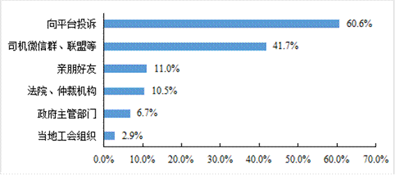 3.16 對于平臺爭議的處理方式,60.6%的貨車司機會首先向平臺客服渠道進行投訴,41.7%和11%的貨車司機選擇通過司機微信群、聯盟以及親朋好友等非正式渠道尋求咨詢幫助,司機微信群正在成為非正式溝通的重要渠道。僅有10.5%的貨車司機選擇法院、仲裁機構等法律渠道解決爭議或尋求法律援助,還有部分貨車司機會尋求政府部門和工會組織幫助,分別占6.7%和2.9%。