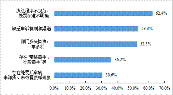 4.4 調查顯示,62.4%的貨車司機認為公路執法程序不規范,處罰標準不明確,對于同一違法事項自由裁量權較大,存在處罰檔次不明確的問題。隨著高速公路超限超載取得積極成效,普通公路治理超載和高速公路治理超限(超長超寬)有待加強。53.3%的貨車司機認為公路執法缺乏申訴機制和渠道,由于司機常年在路上,經常是在路上被罰,很難停下來到當地執法機關提請行政復議。52.3%認為公路執法存在部門多頭執法、一事多罰現象,一些地方交警和路政聯合執法還存在缺位。公平執法、規范執法和聯合執法仍然是貨車司機普遍訴求。36.2%的認為公路執法存在“黃?!钡炔缓侠憩F象。目前,按照《機動車駕駛證申領和使用規定》,貨車司機扣滿12分會被降級處理,即無法從事原有貨運業務,大部分司機在記分周期內扣到3分左右即不敢上路,不僅影響了司機生產生活,也進一步加劇了司機短缺。