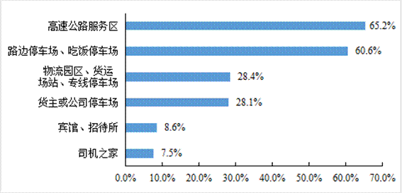 5.4 調查顯示,65.2%的貨車司機會在高速公路服務區休息,60.6%的在路邊停車場、吃飯停車場休息,28%左右的貨車司機在物流園區、場站、貨主等專線停車場進行休息,僅有8%左右的貨車司機會選擇在賓館、招待所或是司機之家休息。